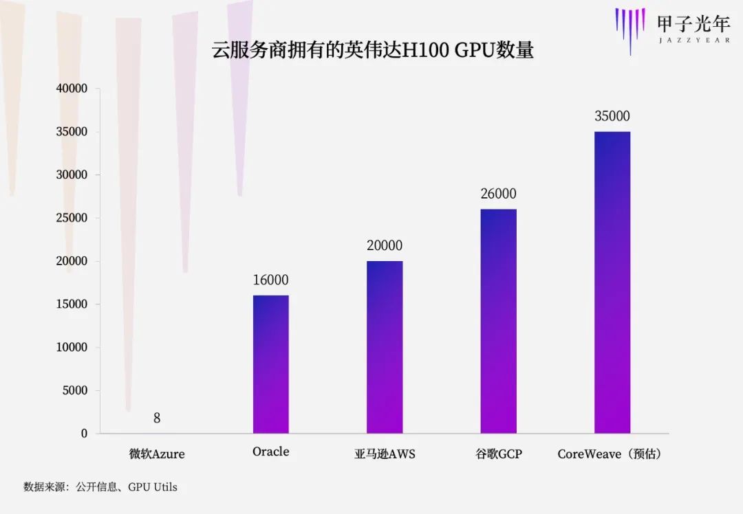 据GPU Utils网站预估,CoreWeave向英伟达预定的的H100数量约为35000-40000张。对比来看,谷歌在今年5月发布的超级计算机A3拥有大约26000个H100,亚马逊AWS在7月上线的EC2 P5 虚拟机实例基于20000块H100构建,微软在8月上线的Azure ND H100v5虚拟机,仅仅包含8块H100。不过,微软拥有大约28.5万块A100。