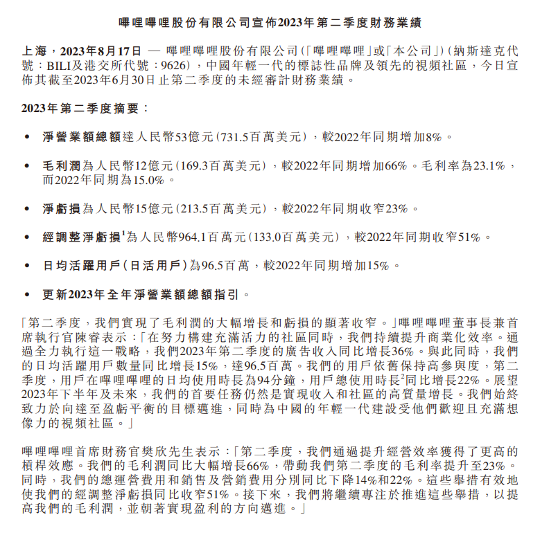 8月17日,B站发布2023年第二季度业绩。上一财季,B站总营收达53.04亿元人民币,相比去年同期增长8%。