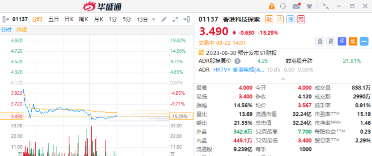 香港科技探索(01137.HK)盈警后跌超15%,触及3.4港元创2020年1月以来新低。截至发稿,跌15.29%,报3.49港元,成交额2990万港元。