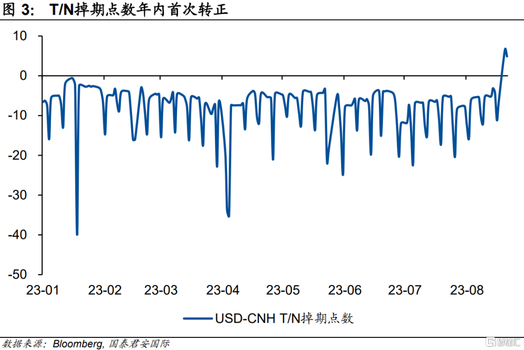 另一个关键点是,我们所谓的即期价格事实上是T+2交割的,也就是说,我们看到的价格要在交易后两个交易日后才能交割。以做空人民币即期为例,如果到期交割,交易员需要付出这两个交易日的人民币与美元的利息之差。而这两天的利息则是由隔夜利率和T/N(明天次日)这两天的利率相加,隔夜利率往往反映的是眼下的资金状况,而T/N则在很大程度上反映了市场预期未来一天的资金状况,因此对于交易而言更加重要。从昨天开始,T/N掉期点数也在年内首次转正,这也意味着市场对离岸人民币流动性将至少保持短期的谨慎看法。