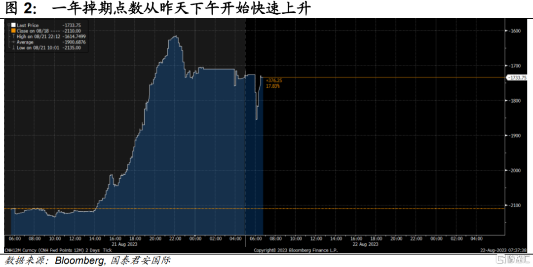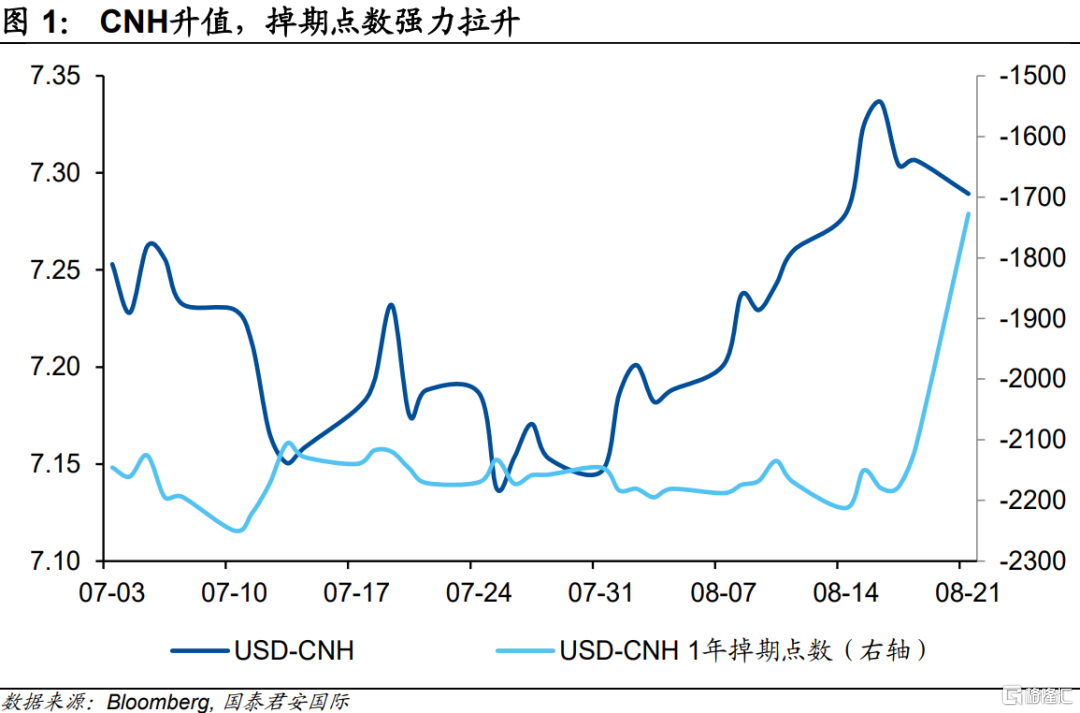 隔夜离岸人民币(CNH)汇率出现拉升,CNH兑美元的汇价再次回到7.30的强方。与此前的几次CNH升值不同,昨天下午北京时间14点左右开始,USD-CNH的一年掉期点数开始出现显著拉升,并从-2100点一线直线拉升至-1600点左右。