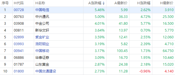 截至发稿,中国电信A股涨5.46%,H股现涨超2%;中兴通讯A股涨5%,H股现涨超4%;中金公司A股涨4.01%,H股现涨超6%。