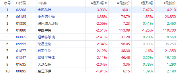金风科技A股跌3.93%,H股现跌超7%;康希诺生物A股跌3.38%,H股现跌1%;中国中免A股跌超2%,H股现跌超1%。