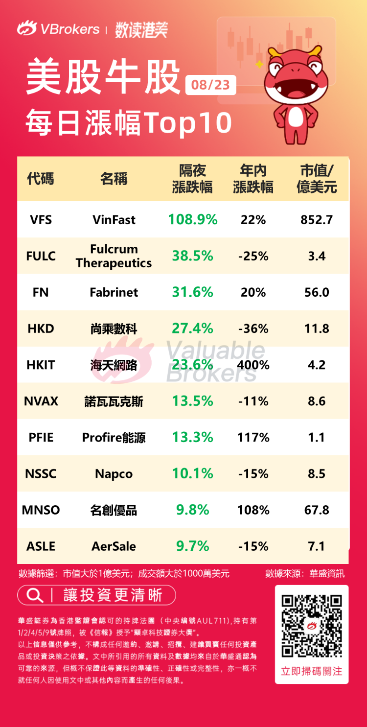 發仔梳理了每日美股涨幅Top10榜单,以下为隔夜美股涨幅靠前的个股: