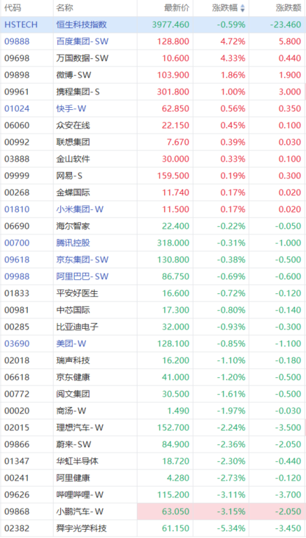 跌幅方面,舜宇光学科技跌超5%,小鹏汽车、哔哩哔哩跌超3%,华虹半导体、蔚来、理想汽车跌超2%,美团、阿里巴巴、京东小幅走弱