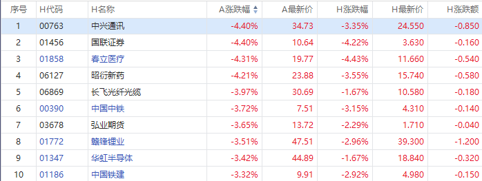 中兴通讯A股跌4.4%,H股现跌超3%;国联证券A股跌4.4%,H股现跌超4%;春立医疗A股跌超4%,H股现跌超4%。