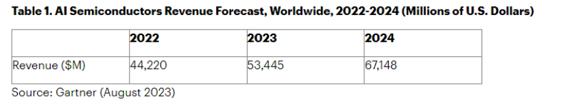Gartner预计,2023年AI芯片市场规模将达到534亿美元,比2022年增长20.9%,2024年将增长25.6%,达到671亿美元。到2027年,AI芯片营收预计将是2023年市场规模的两倍以上,达到1194亿美元。