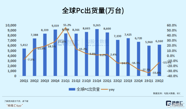 根据IDC,Q2全球PC出货量环比增加了470万台,尽管同比下跌至13.4%,降幅有所收窄,这主要因为去年二季度的基数已经较低。
