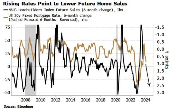 但近期美债收益率和抵押贷款利率的上升似乎还没有完全反映在其股价上。下面的图表显示,30年期固定抵押贷款利率的6个月变化领先NAHB(全美住宅建筑商协会)的未来房屋销售指标约6个月。因此,抵押贷款利率的上升预示着销售很快就会走弱。