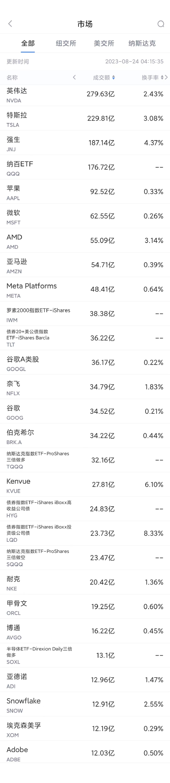 周三美股成交额第1名英伟达收高3.17%,成交279.63亿美元。英伟达第二财季营收135.1亿美元,分析师预期110.4亿美元;第二财季数据中心营收103.2亿美元,分析师预期79.8亿美元;预计第三季度收入在160亿美元上下2%区间,分析师预期125亿美元;批准额外的250亿美元股票回购计划。截至发稿,英伟达绩后大涨超9%。