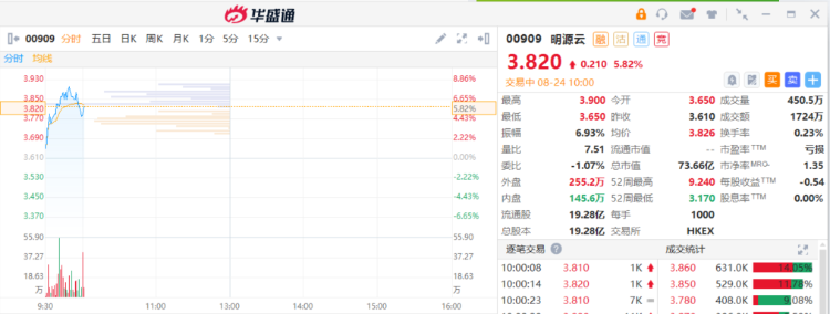 明源云 $00909.HK 盘中一度高涨超7%,截止发稿涨5.82%,报3.82港元,成交额1724万港元。