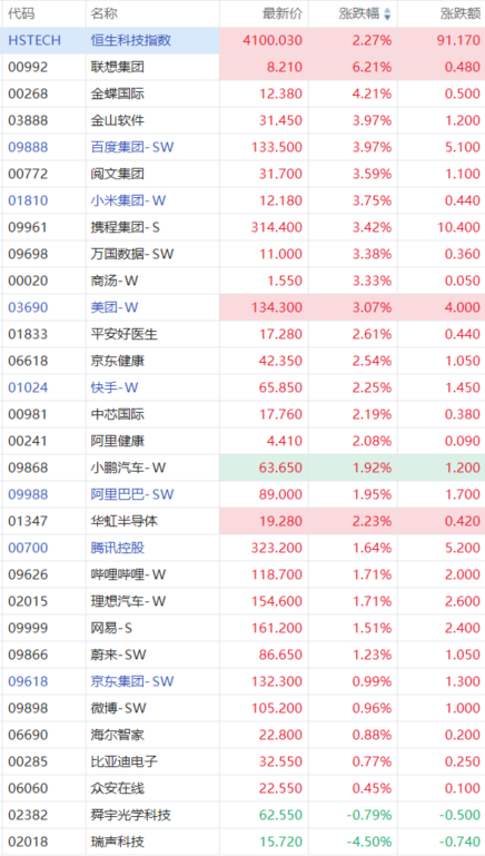 科指成分股走高,联想集团涨超6%,金蝶国际涨超4%,金山软件、百度、小米、商汤、美团涨超3%,快手、中芯国际涨超2%,小鹏汽车、阿里巴巴、腾讯、蔚来涨超1%。