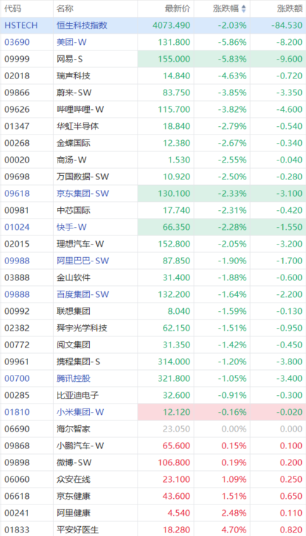 科指成分股多数走弱,美团、网易跌超5%,蔚来、哔哩哔哩跌超3%,金蝶国际、商汤、京东、中芯国际、快手、理想汽车跌超2%,阿里巴巴、百度、腾讯跌超1%。