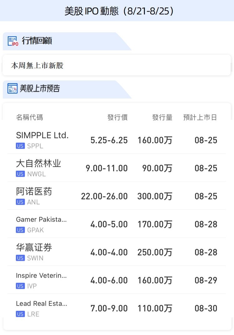 SIMPPLE Ltb $SPPL 、大自然林业 $NWGL 将于今晚上市;Gamer Pakistan, Inc. $GPAK 、华赢证券 $SWIN 、Inspire Veterinary Partners $IVP 、Lead Real Estate Co $LRE 等4只于下周上市。