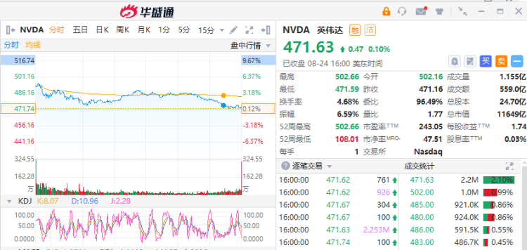 周四(8月24日)美股盘前交易中,该股一度上涨8.8%;截至当日收盘,英伟达微涨,收于每股471.63美元,盘中一度涨超6%。而今年以来,该公司的市值增长了两倍多,超过了1万亿美元。