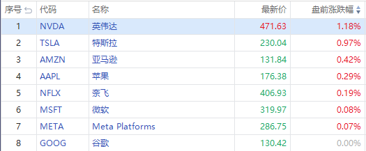热门科技股盘前小幅反弹,英伟达涨超1%,特斯拉 $TSLA 涨0.97%、微软 $MSFT 、亚马逊 $AMZN 、苹果 $AAPL 、meta $META小幅上涨。