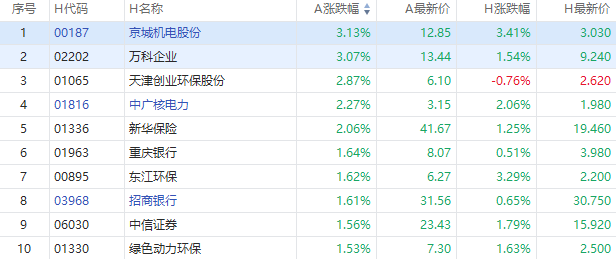 截至发稿,京城机电股份A股涨超3%,H股现涨超3%;万科企业A股涨超3%,H股现涨超5.47%;中广核电力A股涨超2%,H股现涨超2%。