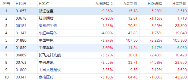 浙江世宝A股跌超9%,H股现跌超4%;弘业期货A股跌超6%,H股现跌超1%;康希诺生物A股跌4%,H股现跌超3%。