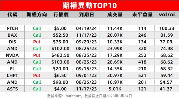 4、Palantir $PLTR 周四收跌7.58%,根据美国证券交易委员会(SEC)8月23日披露的文件,Palantir董事售出32.5万股普通股股份 价值约为500.57万美元。期权方面,隔夜成交45万张,市场交易看涨期权的比例近65%。