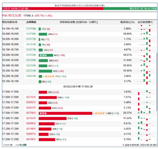街货分布方面,至上周五,恒指牛证街货重货区间主要在收回价17200点至17700点之间,累计相当约4111张期指合约;恒指熊证街货重货区主要在收回价18300点至18700点之间,累计相当约1665张期指合约。