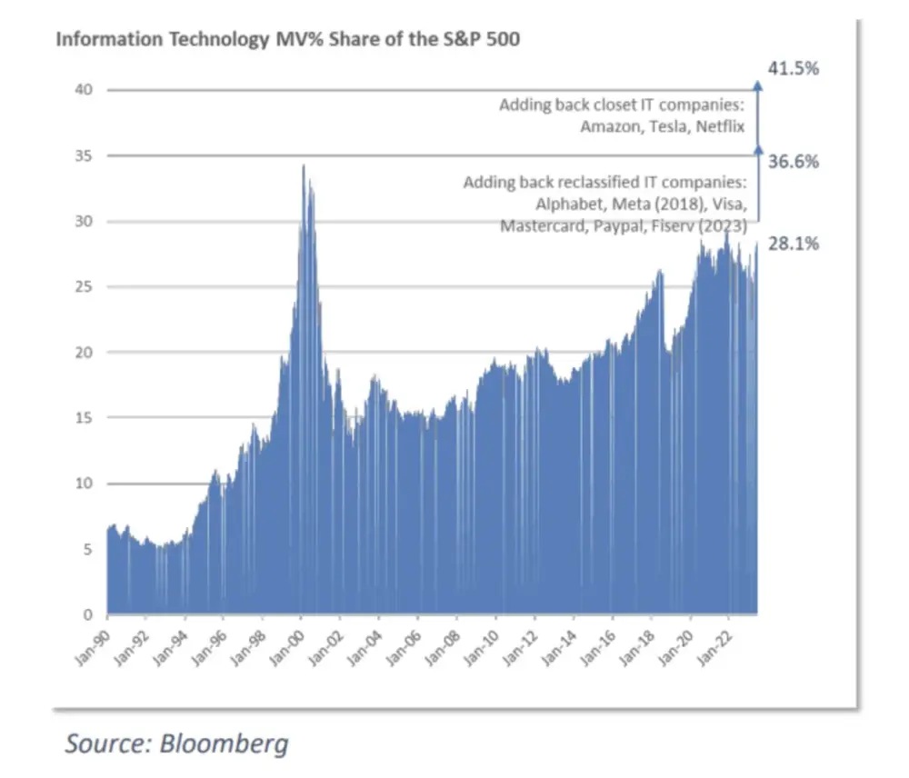 另一种判断这种集中度的方法是,看看科技股在标普500指数中所占的市值份额。在互联网泡沫的高峰期,这一比例超过了34%。如今,这一比例为28%。斯米德说,如果把亚马逊、特斯拉、Netflix、Alphabet、Meta、Visa、万事达、贝宝和Fiserv等曾经或目前被认为属于科技行业的公司也加起来,这个数字就超过了41%。