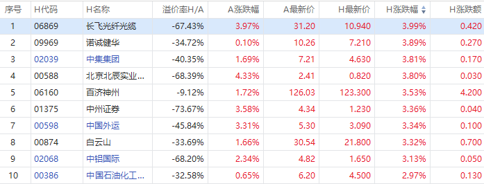 截至发稿,诺诚健华A股涨0.1%,H股现涨近4%;中集集团A股涨超1%,H股现涨3.81%;中州证券A股涨3.58%,H股现涨超3%。