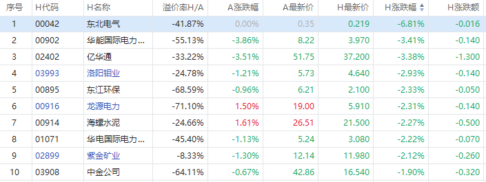 华能国际电力股份A股跌近4%,H股现跌超3%;洛阳钼业A股跌超1%,H股现跌近3%;紫金矿业A股跌1%,H股现跌超2%。