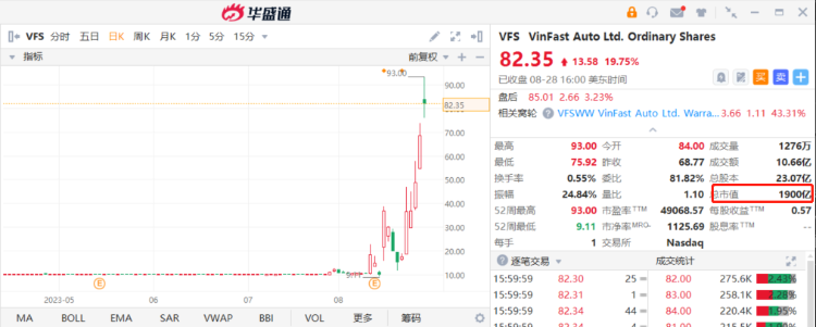 VinFast股价周一收涨20%,至82.35美元,自8月15日上市以来累计上涨688%,目前的市值约为1900亿美元,盘中一度突破2100亿美元,而高盛和波音的市值分别为1110亿美元和1370亿美元。这使得它的规模超过了道琼斯工业平均指数的一半成分股,大约是沃尔格林联合博姿集团的10倍。
