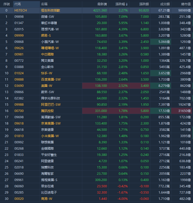 科指成分股走高,哔哩哔哩、网易涨超3%;快手、百度集团、美团、阿里巴巴涨超2%;腾讯、京东、小米跟涨。