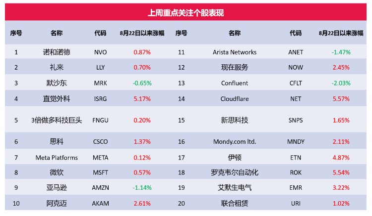 再来看看上期提及重点个股的一周表现,20只个股仅4只下跌,表现最好的是 $NET 、 $ROK 、 $ISRG :