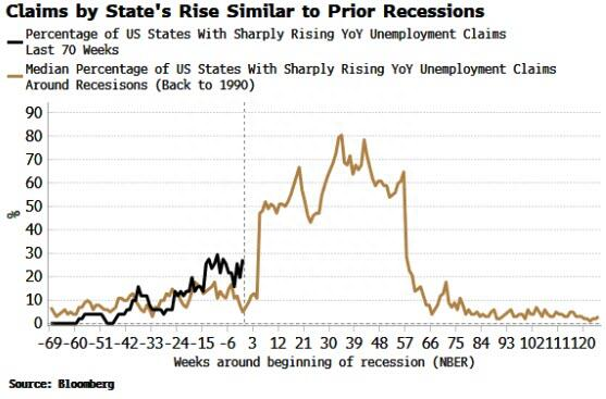 下图显示了今年美国各州申请失业救济人数同比涨幅,以及自1990年以来历次衰退的中位数。过去一年的路径(黑线)与衰退路径(黄色线)相似。