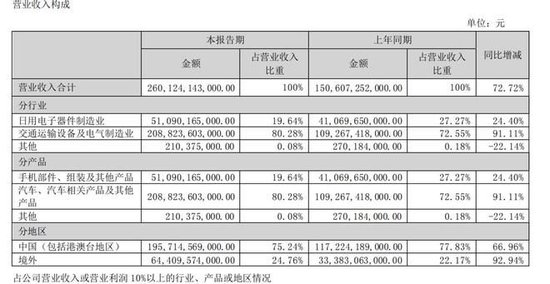 分业务来看,汽车、汽车相关产品及其他产品业务的收入约为人民币2088.24亿元,同比增长91.11%,占总营收的80.28%;手机部件、组装及其他产品业务的收入约为510.90亿元,同比增长24.40%,占总营收的19.64%。