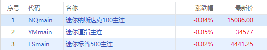 三大股指期货盘前小幅下挫,截至发稿,纳指期货 $NQmain 现跌0.04%,标普500指数期货 $ESmain 跌0.02%,道指期货 $YMmain 跌0.05%。