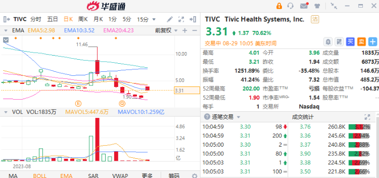 Tivic Health Systems $TIVC 盘初涨幅扩大至71%,报3.29美元。为一家开发和商业化生物电子医学的健康科技公司。
