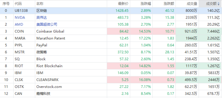 华盛资讯8月29日讯,美股区块链股短线走高,Coinbase $COIN 涨超14%, $RIOT 涨超12%、嘉楠科技涨6.5%、英伟达涨超3.4%。消息面上,美国法院推翻SEC裁决,为首个比特币ETF铺平道路。