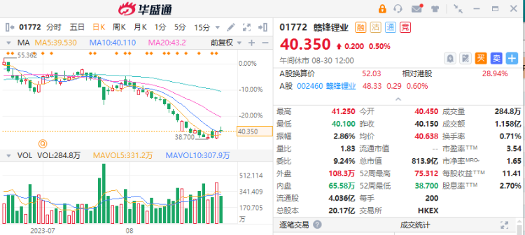 二级市场方面,赣锋锂业股价自1月27日创下75.312港元/股的阶段性高点以来,持续下跌,截止8月30日中午收盘,报40.35港元/股,期间累计跌幅接近50%。