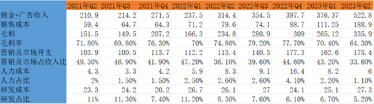 本季度销售成本189亿,同比提升137.3%,主要因为TEMU和多多买菜履约成本驱动,因为多多买菜与TEMU本质上都是全托管模式,供应商向拼多多供货,给予一个供货价,拼多多来控制前端售价,中间的差价计入佣金类目收入,这些收入需要负担TEMU国内仓库到海外消费者手中的履约成本,所以它的毛利率肯定会低于主站这种完全的第三方平台轻资产模式,多多买菜类似,佣金收入需要负担城市大仓到终端社区的物流费用以及门店的费用,两者区别只在于TEMU针对国际市场,而多多买菜面向国内市场。