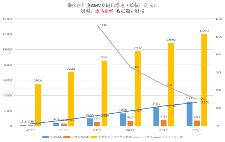 作为参考,我们整理了过往年度的GMV及国内实物电商行业整体规模,以及双方的比重,2022年拼多多理论上已经占据了国内电商行业26%左右的市占率,当然这个数据有一定水分,因为各家平台公布的GMV相较于统计局公布的实物电商行业GMV口径更宽松一些,会将下单未支付、未发货已退款订单都纳入其中,但看它历年的市场份额趋势,还是能看出来拼多多是在明显增加市占率的。