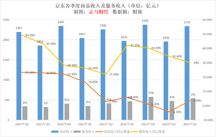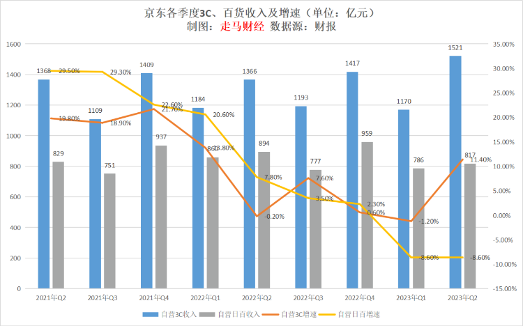 等到疫情一结束,它的问题越发明显,从2022年Q4开始,京东的自营业务增速分别是1.2%、-4.3%、3.5%,均远低于实物电商行业增速。