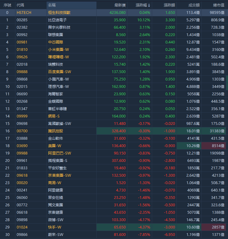 科网股走势分化,小米集团涨超2%,哔哩哔哩涨近2%,百度集团涨1.40%;腾讯、美团、阿里巴巴跌近1%,商汤跌超1%。