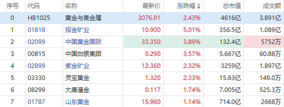 8月30日,港股黄金股集体走高,截至发稿,招金矿业涨超5%,中国黄金国际、中国白银集团涨超3%,紫金矿业、灵宝黄金涨超2%,山东黄金涨超1%。