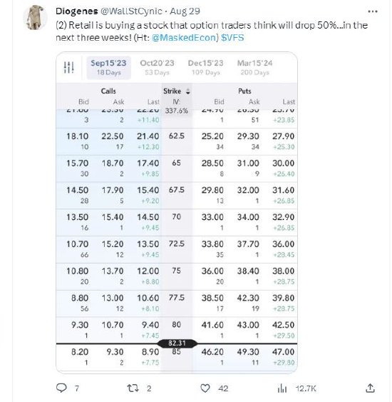在另一条帖子中,查诺斯引用了VinFast的期权交易数据,并评论称:“散户正在买入一只期权交易者认为未来三周内将下跌50%的股票!”
