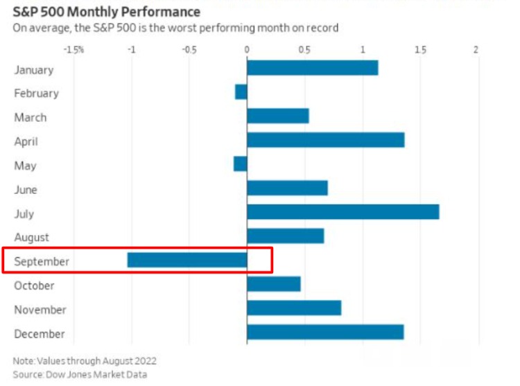 据CFRA Research首席投资策略师Sam Stovall称,自1945年以来,标普500指数在9月份的平均月回报率为-0.73%,是平均表现最差的月份。这也是唯一一个标普500指数月度下跌次数多于上涨次数的月份,为美股全年表现最差一个月份。
