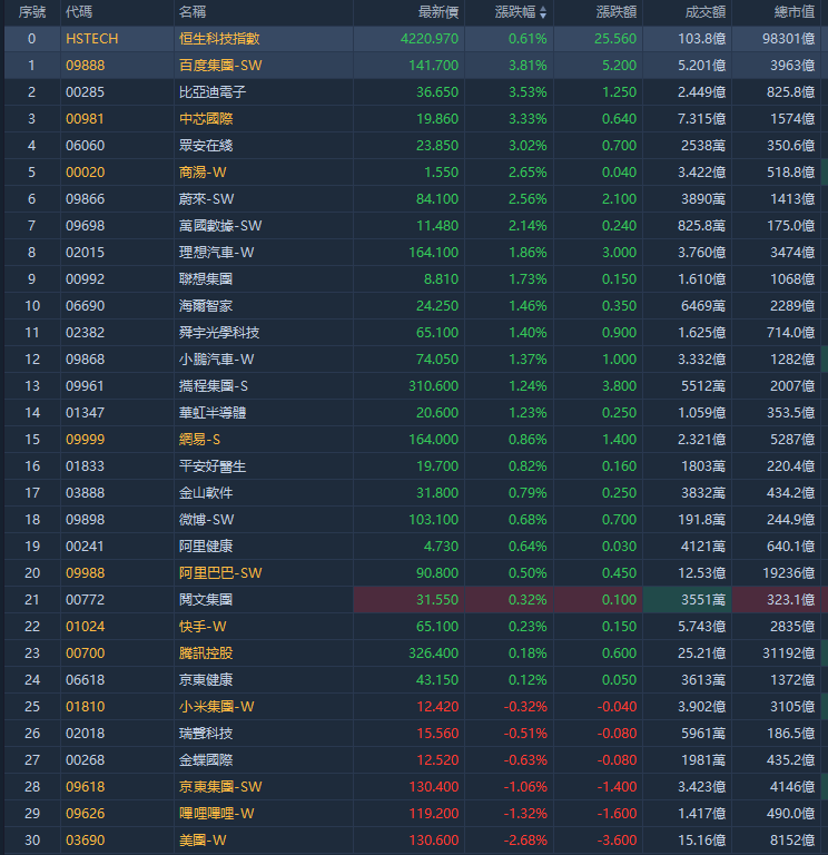 AI概念股领涨科技股,百度集团-sw涨近4%,商汤-W涨2.65%。