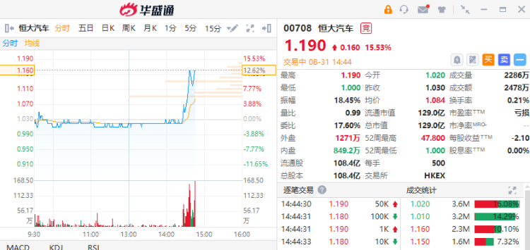 华盛资讯8月31日消息,恒大汽车午后短线走强。截至发稿,现涨15.53%,报1.19港元,成交额2478万港元,最新总市值129亿港元。