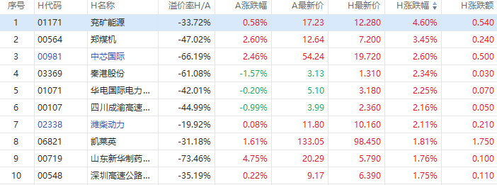 截至A股收盘,AH股涨幅前10如下:
