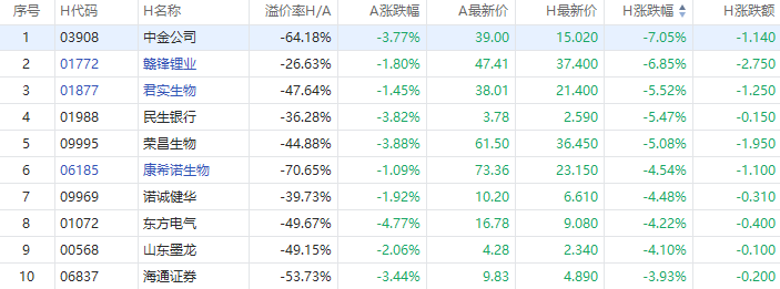截至A股收盘,AH股跌幅幅前10如下: