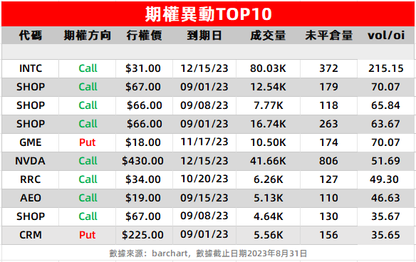 期权市场中,英特尔 $INTC 的一笔行权价为31美元,到期时间为12月15日的Call单成交量达到了8.0万张,远超过其未平仓数374张,V/OI值高达215.15。这意味着248万美元资金看涨英特尔。