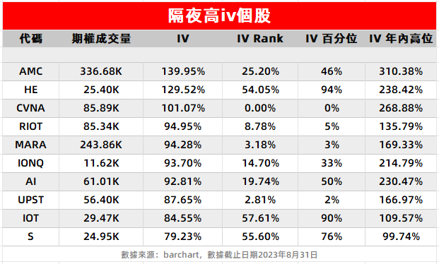 1、AMC院线 $AMC 隔夜收跌1.41%,报12.55美元每股;隔夜期权成交超33.67万张,该股持续位列位于高IV个股榜第一名。