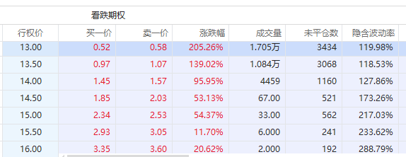 期权链上最活跃的是今晚到期、13美元行权的PUT,成交1.705万张,未平仓3434张,隔夜涨幅205.26%;其次是今晚到期,13.5美元行权的PUT,成交1.084万张,未平仓仅有3086张,隔夜涨幅139.02%。
